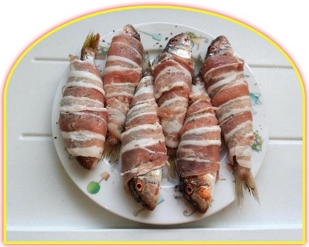 - Entourer chaque poisson d’une tranche fine de lard fumé pour retenir la farce,